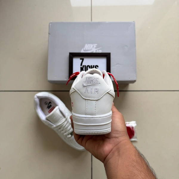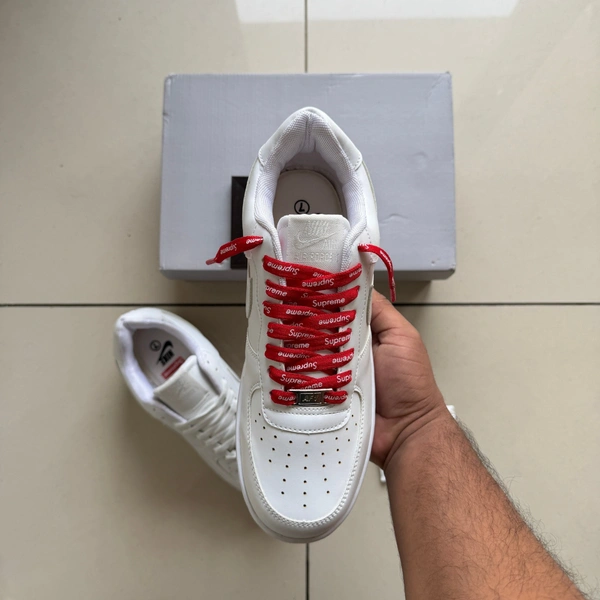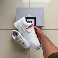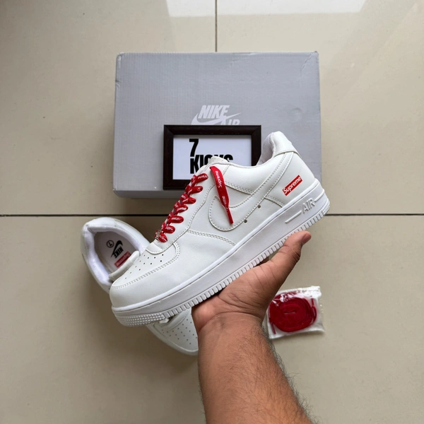 Step up your sneaker game with the highly sought-after White Nike Air Force sneakers, featuring striking red Supreme highlights. This unique design not only elevates your style but also ensures you stand out in any crowd. The perfect blend of classic and contemporary, these sneakers are a must-have for fashion enthusiasts.